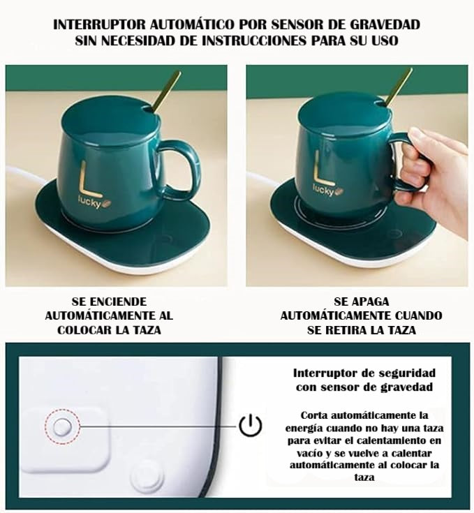 Hay un dispositivo de inducción por gravedad en la parte inferior del calentador de café. Cuando el dispositivo detecta que se ha colocado una taza con líquido sobre el calentador, la base de calentamiento con apagado automático comenzará a funcionar; y cuando se retire la taza, la placa calentadora se detendrá automáticamente. Si eres una persona que cuida el medio ambiente y busca eficiencia energética, te encantará este calentador de taza para café.
